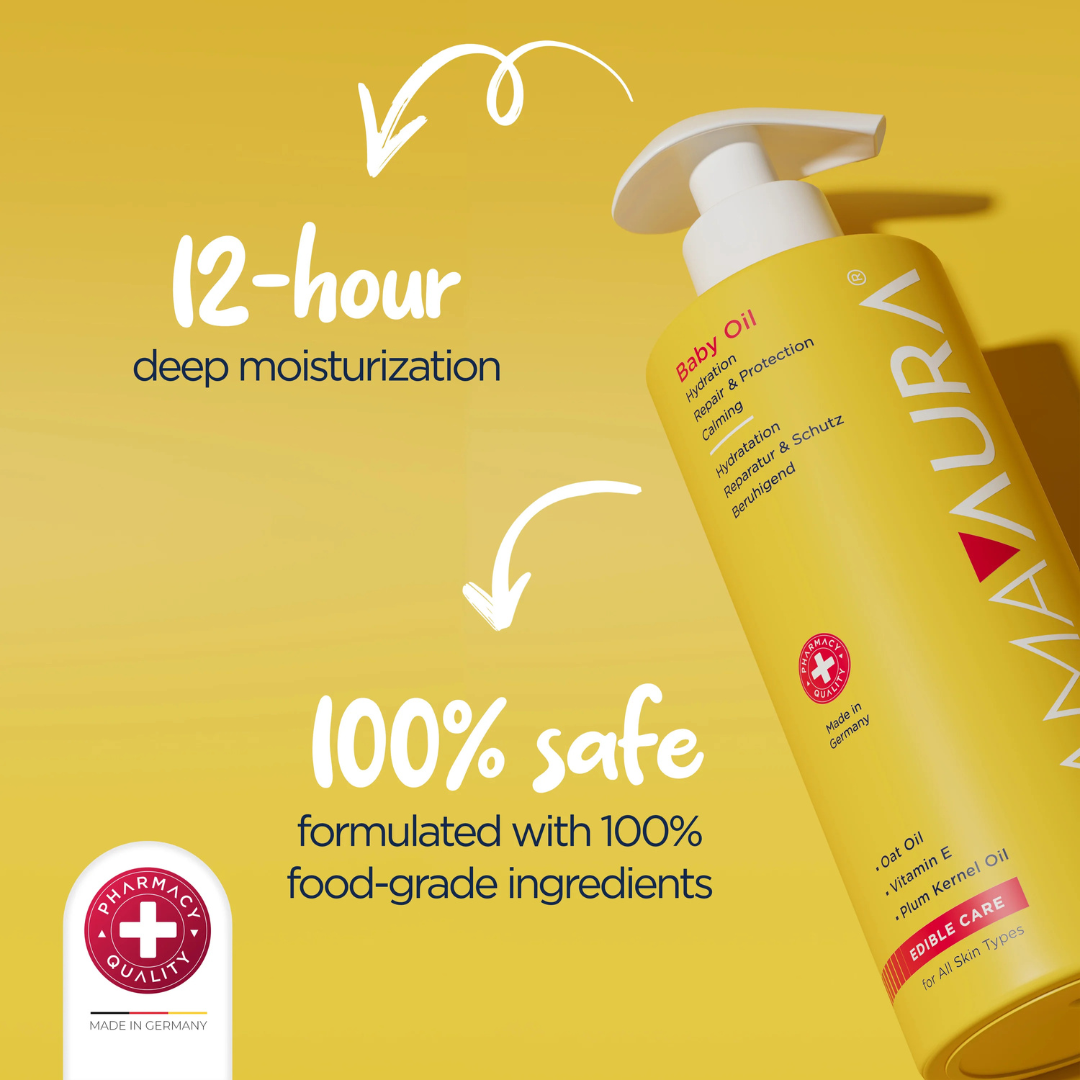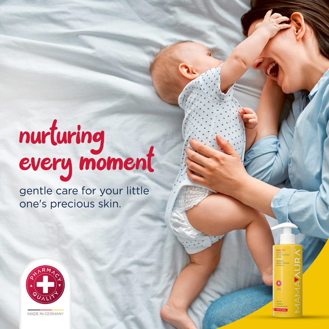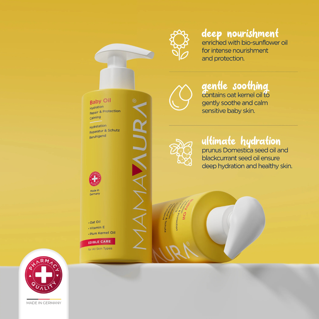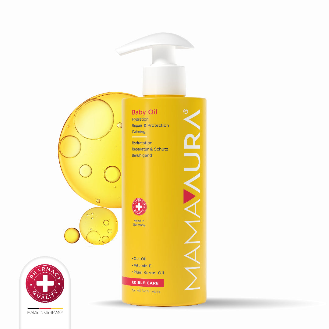 Uleiul Baby Oil oferă hidratare și protecție pentru pielea delicată a bebelușului, menținând nivelul optim de hidratare timp de până la 12 ore. Vitamina E calmează iritațiile, prevenind apariția acestora, inclusiv în zona scutecului și în cazul pielii afectate de eczemă atopică. Acest produs nu conține alcool, uleiuri esențiale, coloranți, parfum, gluten sau microplastice.