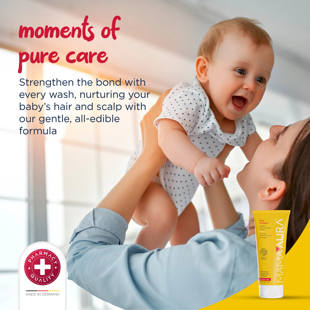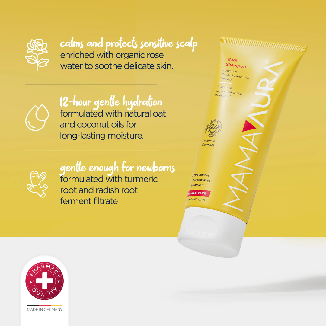 Șamponul pentru bebeluși Mamaaura curăță, hidratează și calmează delicat părul și scalpul bebelușului, fiind ideal pentru pielea sensibilă. Formulat cu aminoacizi din ovăz, ulei de cocos organic și glicerină vegetală, oferă hidratare profundă și protejează scalpul. Infuzat cu apă de trandafiri și probiotice, susține un scalp sănătos și reduce riscul de cruste de lapte. Este testat dermatologic și potrivit pentru utilizare zilnică.