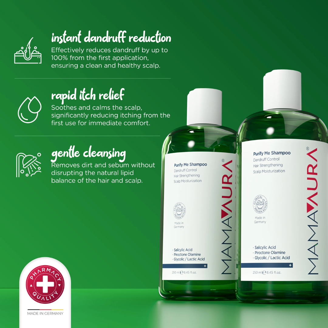 Șamponul Purify Me Shampoo este îmbogățit cu ingrediente eficiente precum acidul salicilic, acidul glicolic, acidul lactic și piroctona Olamine. Acestea elimină până la 100% din mătreață încă de la prima aplicare. Piroctone Olamine din șampon optimizează echilibrul microbian din scalp, prevenind reapariția mătreții și, în același timp, calmând pielea.