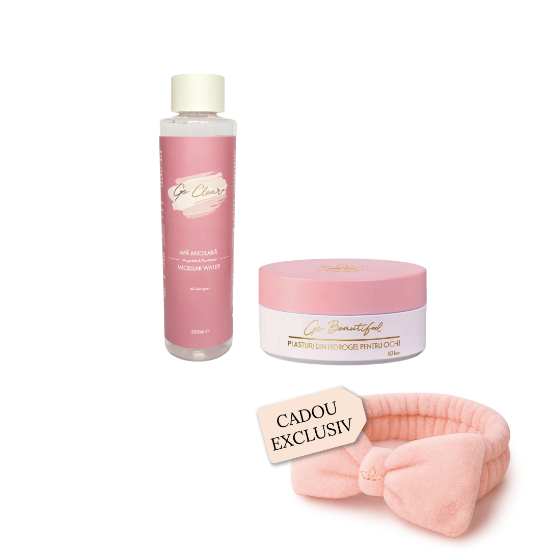 Restart în fiecare dimineață. Pachetul combină plasturii pentru ochi și apa micelară pentru un start de zi luminos și hidratat. Texturi fine, ingrediente blânde și rezultate rapide — tot ce ai nevoie pentru un look fresh în sezonul rece. Bentița roz vine cadou, pentru o rutină curată și practică.