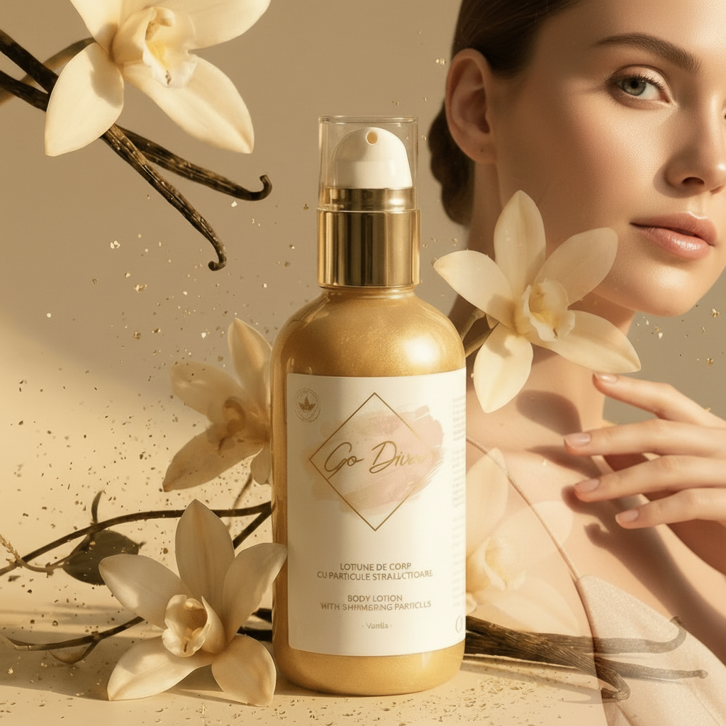 GO DIVA – Loțiune cu particule strălucitoare de aur - Vanilie : un amestec magnific de ingrediente naturale și microparticule de aur , care lasă pielea radiantă și seducătoare, învăluită de note gurmande de vanilie.