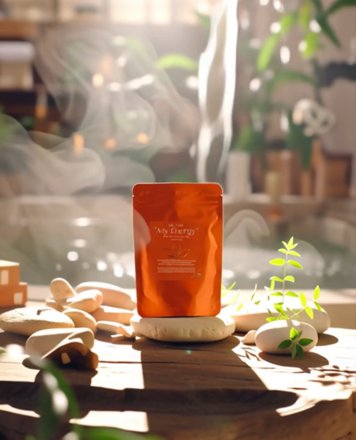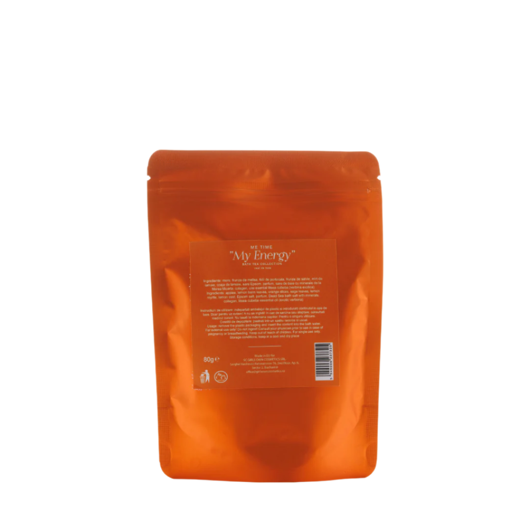 Ingrediente: mere, frunze de melisa, felii de portocală, frunze de salvie, mirt de lămâie, coajă de lămâie, sare Epsom, parfum, sare de baie cu minerale de la Marea Moartă, colagen, ulei esențial de litsea cubeba (verbina exotică).